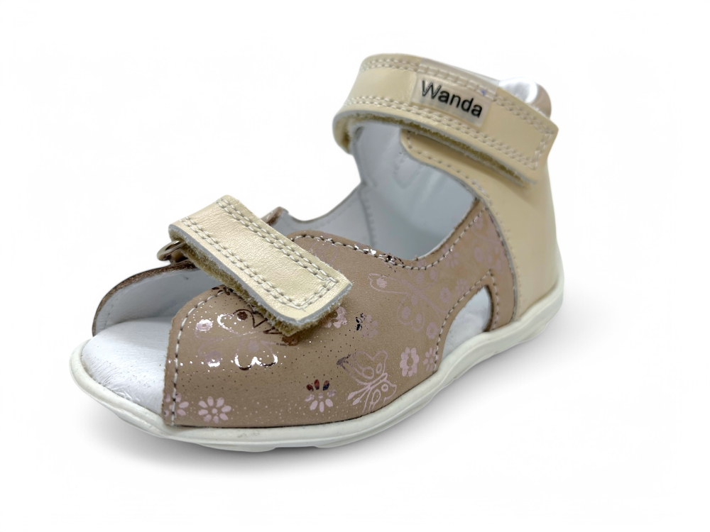Materiál: Je zdravotne nezávadná, vyrábaná výhradne z certifikovaných polotovarov Európskeho pôvodu. Zvršok je z prírodnej hovädzej alebo teľacej kože. Podšívka v sandálkach Wanda je tiež z prírodnej kože. Stielky sú kožené perforované, čo zaručuje rýchle vyparovanie vodných pár, aby sa noha nepotila. Taktiež sú vybavené podporou klenby pre lepší vývoj detskej nôžky.